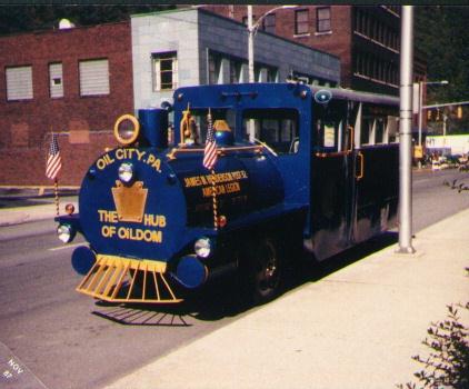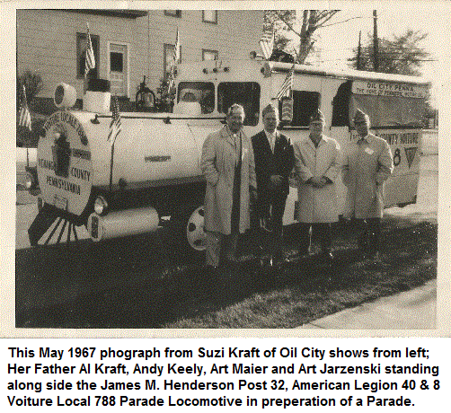 One of Oil City,s most popular icons was the American Legion Locomotive. A converted 1948 GMC school bus was made into a locomotive on wheels. The boiler barrel, cow catcher and other parts were made by the brown boilier works of Oil City. The balance of materials were contributed to the Post as well as the railroad bell and the cannon. The locomotive was often featured in parades across the country as the lead unit in National American Legion convention Parades.